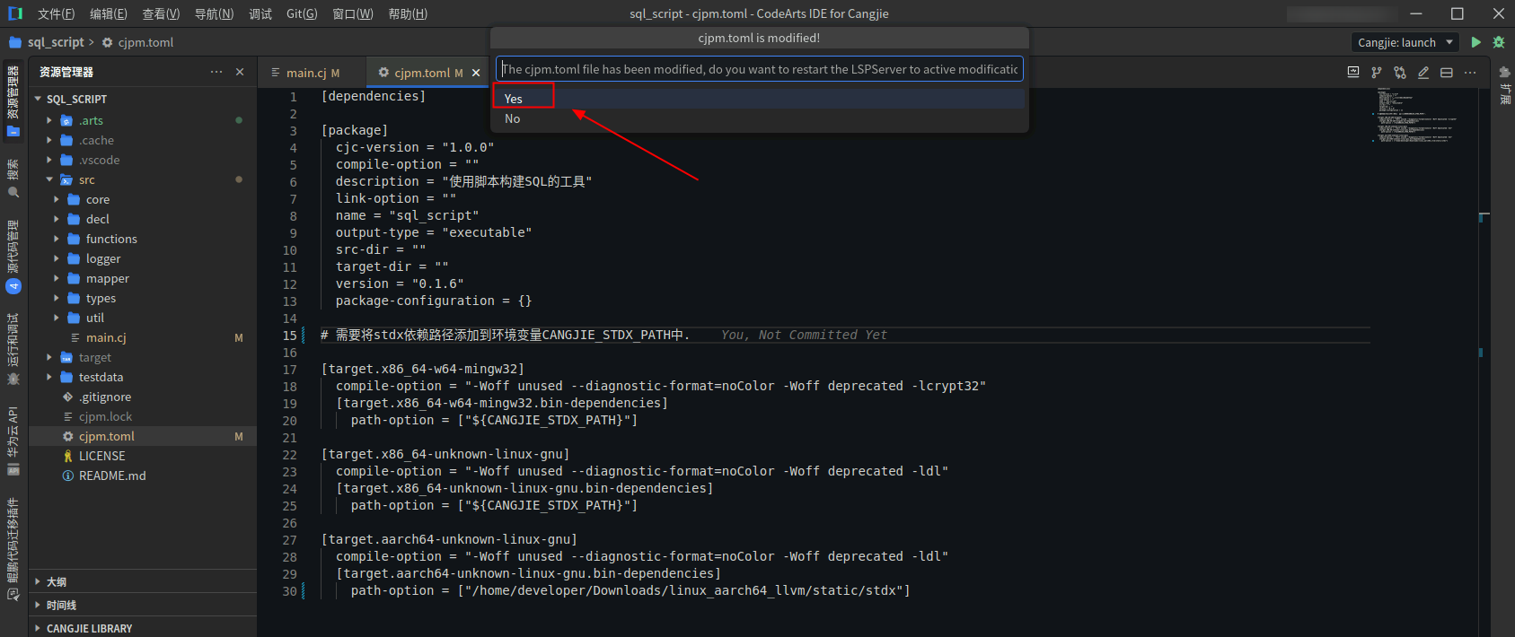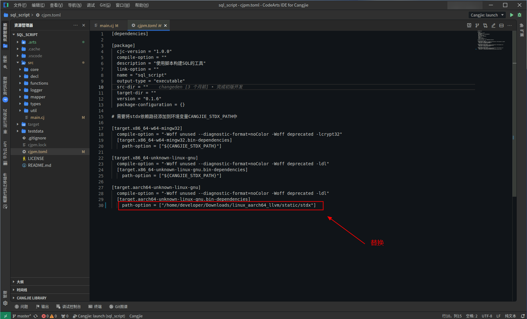 在仓颉编辑器左侧项目工程目录中找到cjpm.toml文件,替换原配置项[target.aarch64-unknown-linux-gnu]的path-option参数,参考如下。