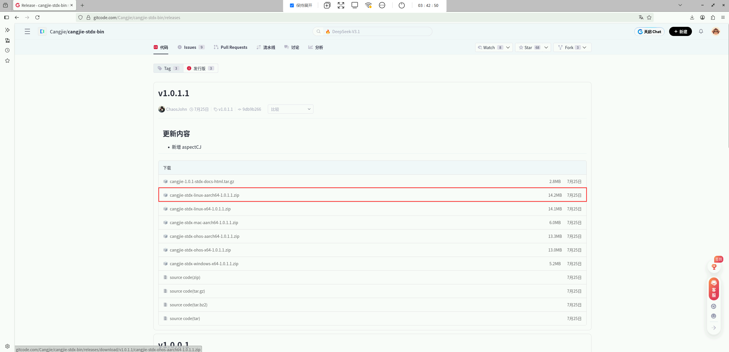 云主机打开火狐浏览器,登录仓颉 gitcode 代码仓:https://gitcode.com/Cangjie/cangjie-stdx-bin/releases,下载stdx插件。