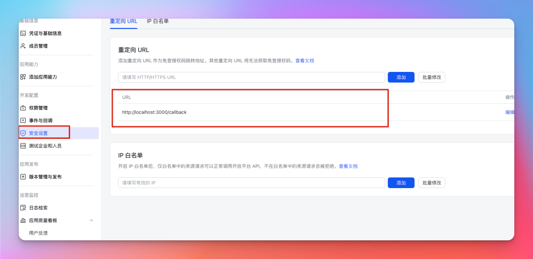 安全设置这里把这个本地重定向 URL 加上: