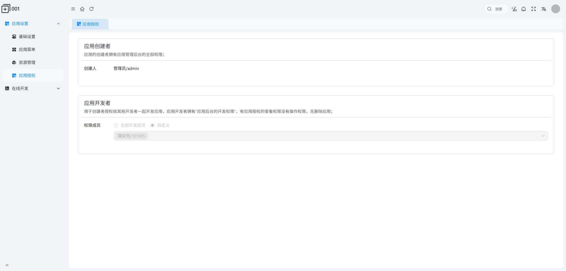 开发者登录后(如 101005),能看到 “001” 应用的开发权限,但在 “应用授权” 页面只能看,不能改配置。