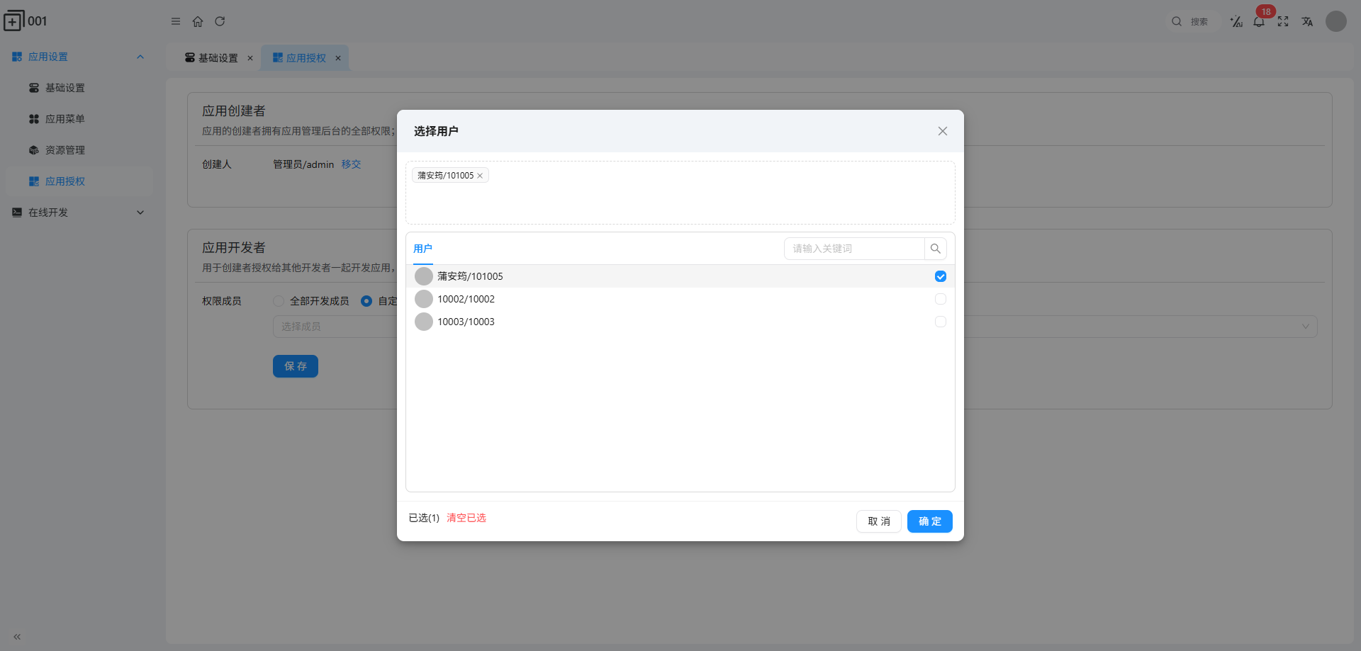 场景 2:选 “自定义”(适合指定少数人开发)若只想让 101005 一个人开发 “001” 应用: