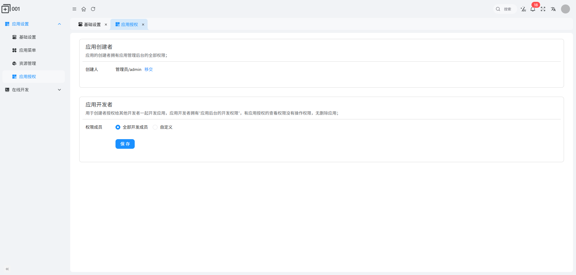 “应用授权” 的核心是划分应用的 “管理权限” 和 “开发权限”—— 前者归创建者,后者给开发者,操作入口很固定:进入目标应用后台(应用中心点击应用图标),在 “应用设置” 里找到 “应用授权”,页面清晰分 “应用创建者” 和 “应用开发者” 两大块,谁有权操作、能改什么,一看就懂。