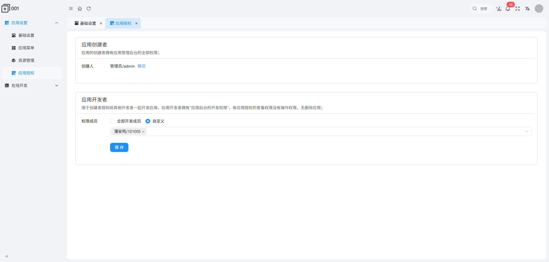 点击 “保存”,此时所有拥有 “开发者” 角色的用户(比如 101005、10002),都会自动成为 “001” 应用的开发者;