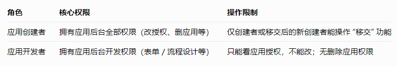 应用授权的操作围绕 “修改应用开发者” 和 “移交应用创建者” 展开,两者操作逻辑不同,按场景拆解如下,结合案例更易理解: