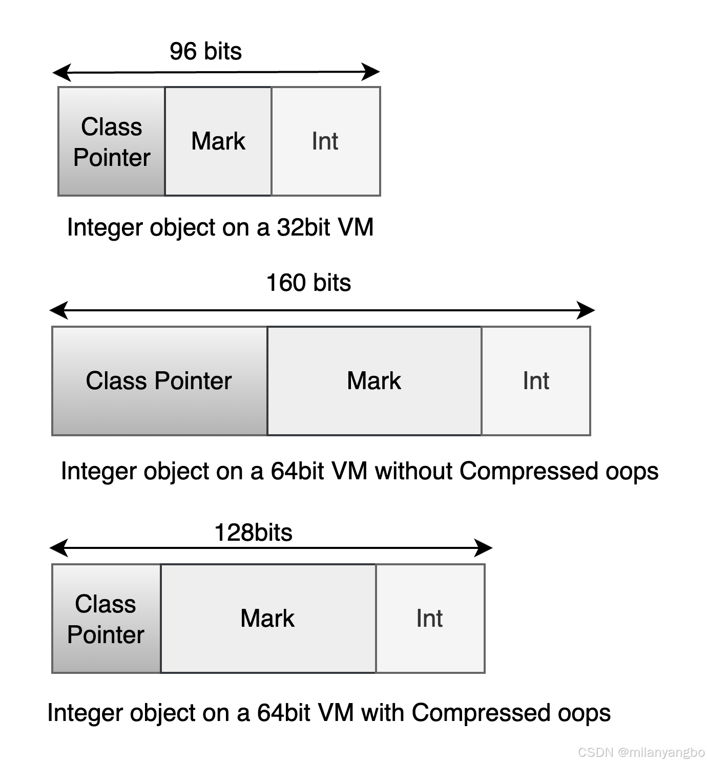 在 64 位 Java 虚拟机中,对象头部的 Mark Word 和 Klass Pointer,分别占据 64 位,因此每个 Java 对象的内存额外开销就是 16 字节。以 Integer 类为例,它仅有一个 int 类型的私有字段,占用 4 字节,因此,每个 Integer 对象的内存开销至少增加 400%。这也是 Java 引入基本数据类型(Primitive Data Type)的原因之一。在 64 位系统中,普通的对象引用通常需要 64 位(8 字节)的空间。然而,对于许多应用程序,这种大尺寸的引用是不必要的,因为它们的堆内存使用量远小于 64 位地址空间的上限(即 18 亿 GB)。因此,64 位 Java 虚拟机引入了压缩指针(Compressed Pointer)技术,将 Java 对象指针压缩为 32 位。这样,对象头部中的 Klass Pointer 也被压缩为 32 位,从而将对象头部的大小从 16 字节减小到 12 字节。