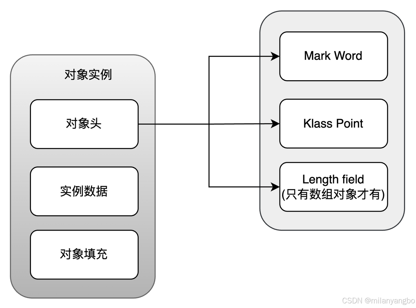 对象头由两个字(计算机术语,表示计算机处理数据的最小单位)组成。如果对象是一个 Java 数组,对象头中还必须包含一部分用于记录数组长度的数据,因为虽然 Java 虚拟机可以通过 Java 对象的元数据信息确定 Java 对象的大小,但无法从数组的元数据中确定数组的大小。对象头的两个字分别是 Mark Word 和 Klass Pointer。1)Mark Word:即标记字段,用于存储对象自身的运行时数据,如哈希码(HashCode)、垃圾回收分代年龄、锁状态标志、线程持有的锁、偏向线程 ID、偏向时间戳等。2)Klass Pointer:即类型指针,是对象指向它的类元数据的指针,Java 虚拟机通过这个指针来确定这个对象是哪个 Java 类的实例。实例数据实例数据部分存储对象的属性字段信息。如果对象没有属性字段,那么这部分就不会有数据。字段类型的不同会占用不同的字节,例如,boolean 类型占 1 个字节,int 类型占 4 个字节等。