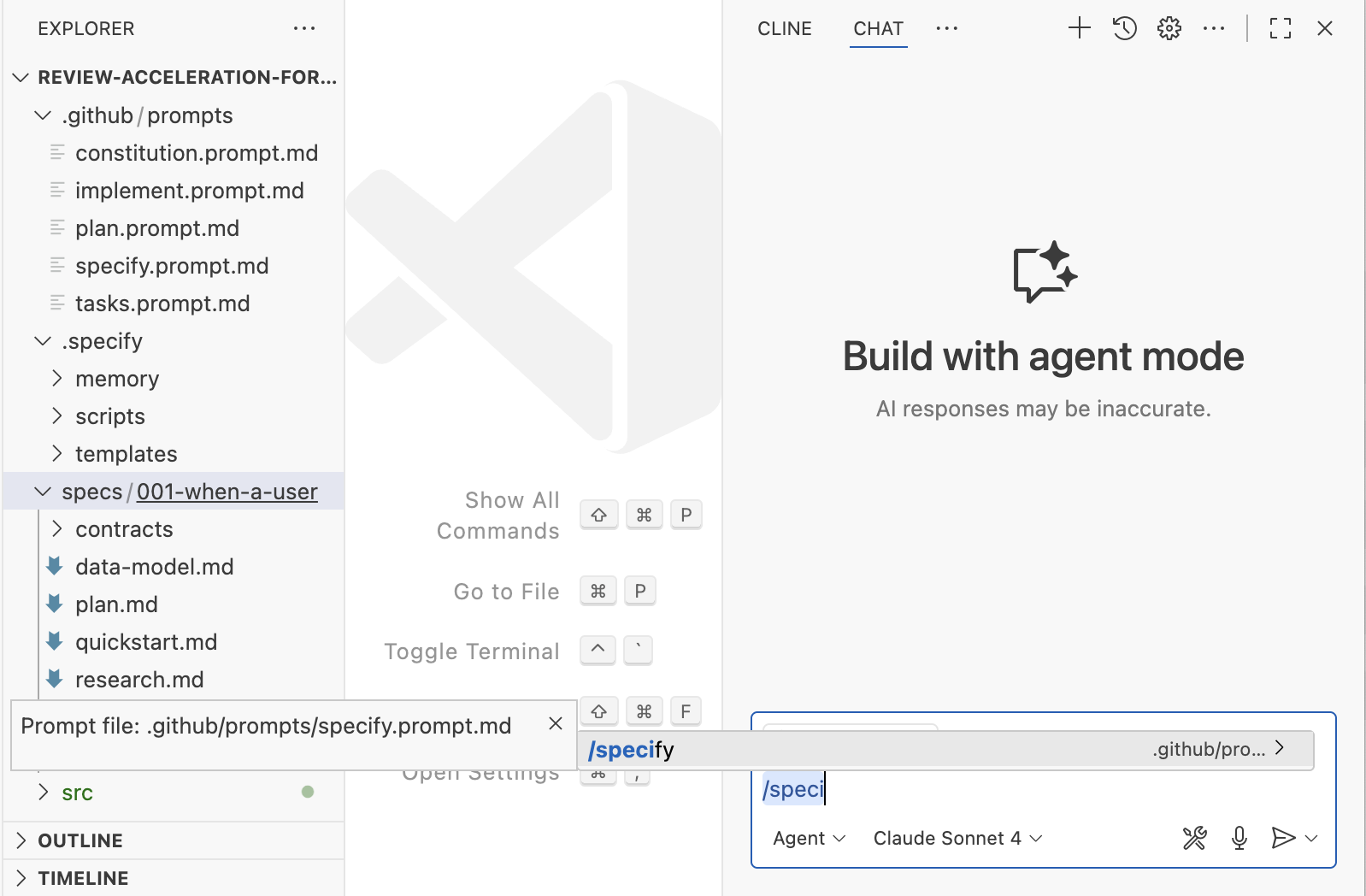 spec-kit 是 GitHub 版本的 SDD 实现。它以命令行界面 (CLI) 的形式分发,可以为多种常见的编码助手创建工作区设置。一旦结构设置完毕,你就可以在编码助手中通过斜杠命令 (slash commands) 与 spec-kit 互动。由于它的所有产物都直接放入你的工作区,这使得它在三者中成为最可定制的一个。