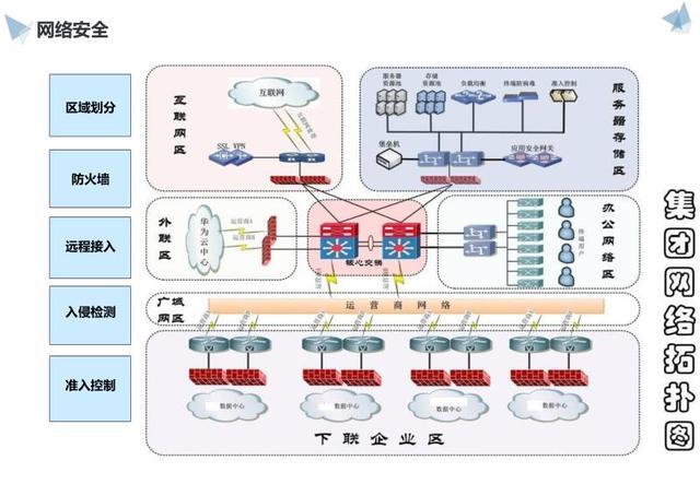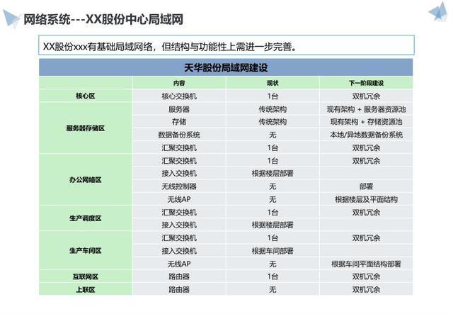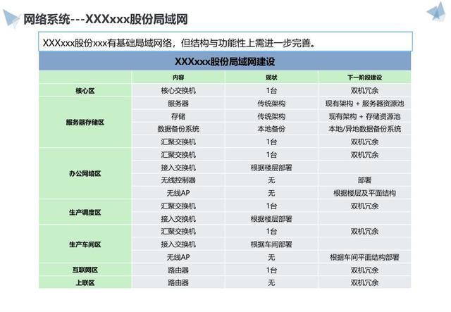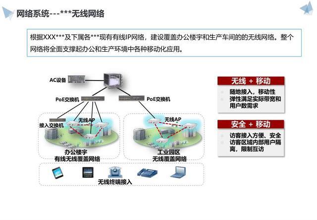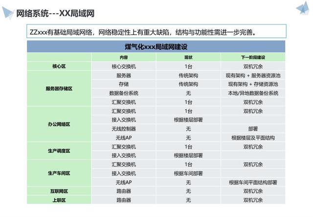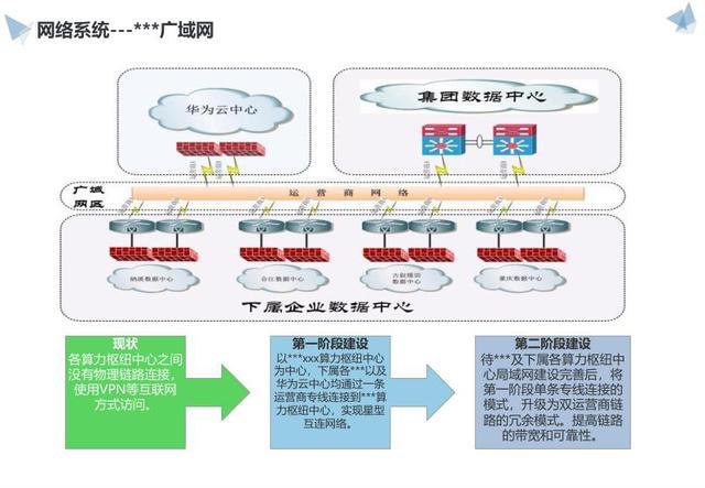 网络优化升级:局域网依据功能划分区域,核心设备采用双机冗余配置;广域网从 VPN 升级为星型专线互联,最终达成双运营商链路冗余;构建覆盖办公楼宇与车间的无线网络,支持移动化办公应用。