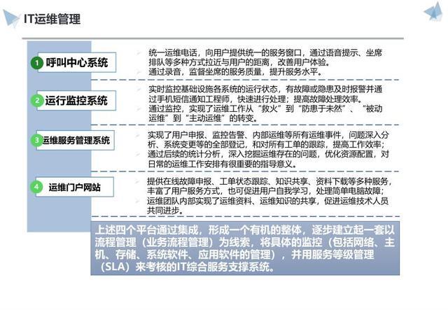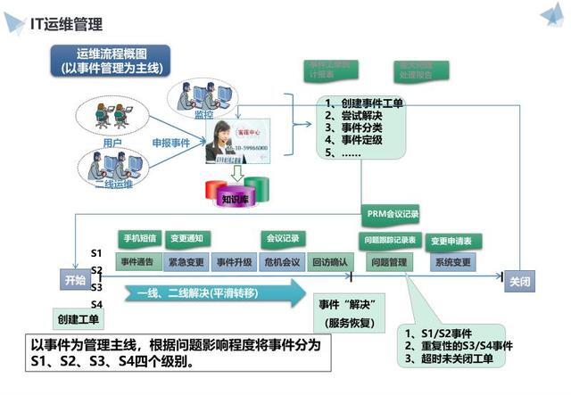 运维管理优化:借助监控系统、工单管理及呼叫中心实现主动式运维,依据事件级别(如 S1 - S4)进行分级响应,提高故障处理效率。