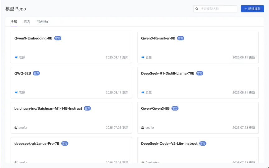 一是,大小模型全流程管理。平台推出基于 Git 的模型管理方案——模型 Repo,支持从 Hugging Face、ModelScope 等主流平台自动获取基座模型权重文件,对微调后的模型进行版本化存储与统一管理,确保每一次模型微调实验过程可追溯、结果可复现,让 AI 研究更透明、更可靠。