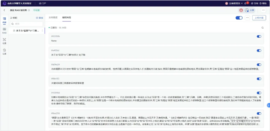 三是,学科垂直领域私有知识库建设。针对实验室独有的边疆文献等资料,平台开发了 RAG 知识库系统,支持本地私有化存储与知识提取。该系统以文件知识库为基础,支持多格式文档自动分段、清洗及索引构建,并可灵活配置相似度阈值和检索结果数量(Top K 值),显著提升大模型生成内容的准确性与可信度,在保障数据安全与知识产权的同时,为人文研究提供坚实可靠的知识底座。