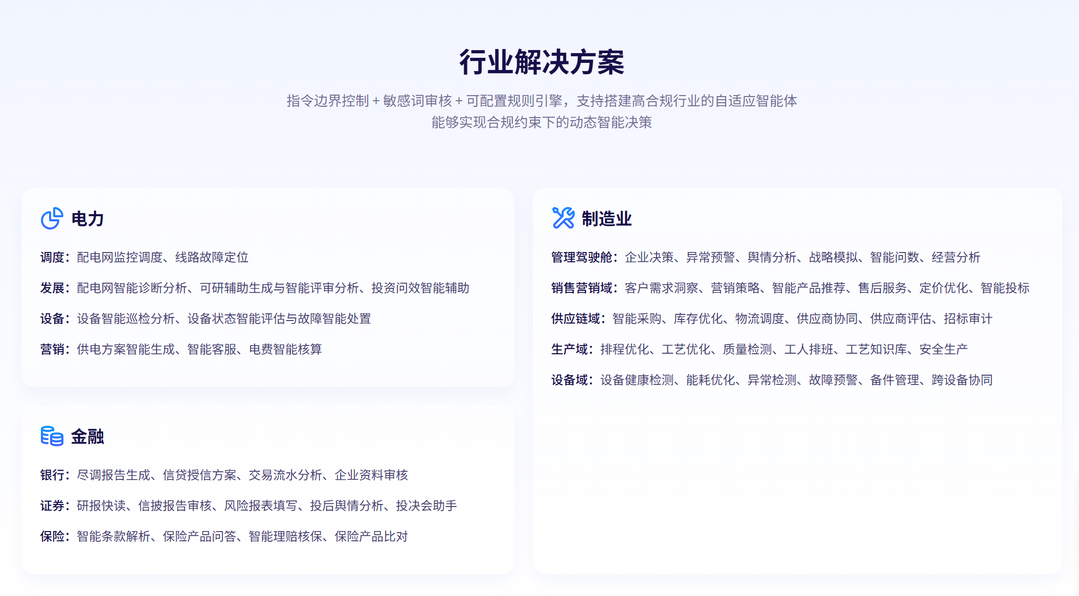 规模化落地的核心,是“灵搭”对业务人员的低门槛友好性。在国家电网、东方证券、中化集团等头部企业,“灵搭”智能体已成为业务人员的“得力助手”,全程无需技术团队介入:电力领域,调度人员通过可视化配置调整智能体即可完成配电网监控与故障定位,设备巡检人员轻松实现设备状态评估与故障处置;金融领域,银行信贷人员用自然语言生成智能体完成授信方案制定与交易流水分析,证券人员依托智能体实现信披审核、投决会辅助;制造业领域,生产管理人员拖拽模块搭建排程优化智能体,供应链人员利用智能体快速实现库存优化与物流调度。这些场景均实现业务效率提升 100%以上,人为失误率显著降低。