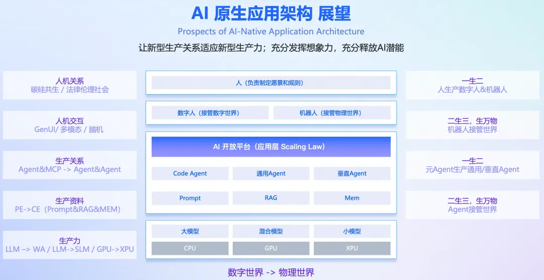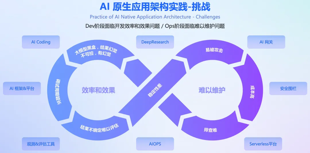 当然随着业务复杂度,智能化程度不断提升,多 Agent 架构和微服务架构有更多相通之处,两边的链接也在加强。未来我们判断每个应用后面都是大量智能体和工具协作完成的,云原生和 AI 原生架构双轮驱动高速发展。