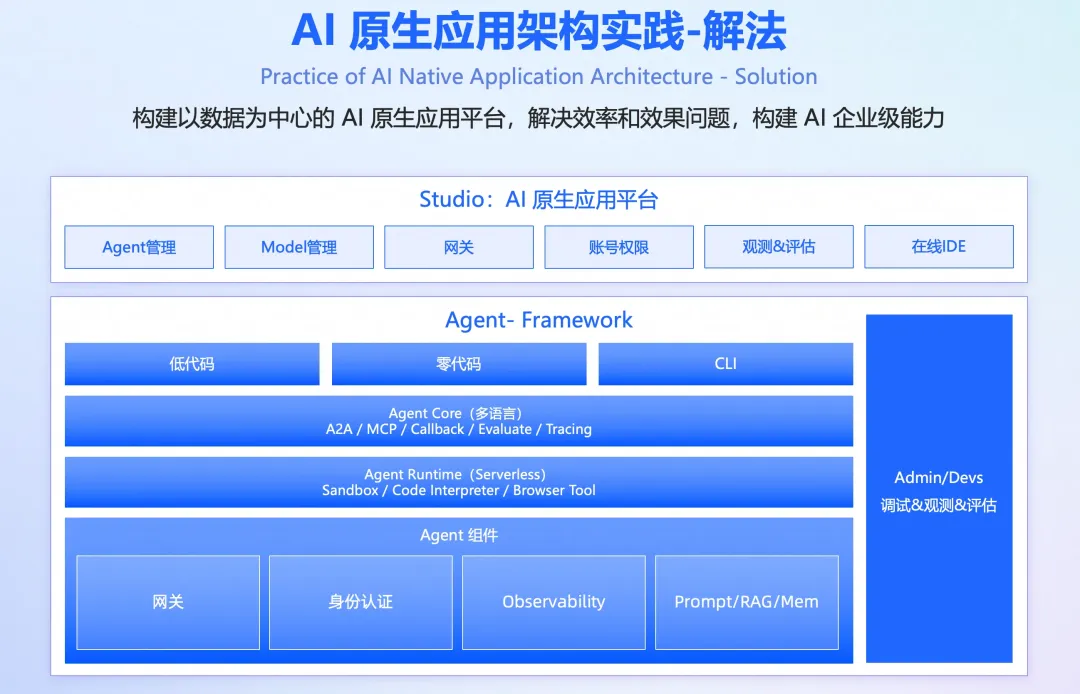 为了解决上面问题,我们需要构建一个简单、易用、专业的开发框架,提升研发效率。构建一个以数据为中心的 Agent 开发平台,通过 调试、观测、评估一体化解决 Dev 阶段调试效率和效果问题。构建 AI 原生应用开发平台(通过 AI 网关解决多模型超时重试、Failover、灰度、Token 流控和额度管理提升模型稳定性;通过 AI 网关接入安全护栏无侵入解决安全合规问题;通过 AI 网关语义缓存,智能路由,AI 消息解决成本问题;通过 Serverless 平台解决极致弹性问题;通过端到端可观测 &评估体系解决排查难,效果追踪问题)解决 Ops 阶段难以维护问题。