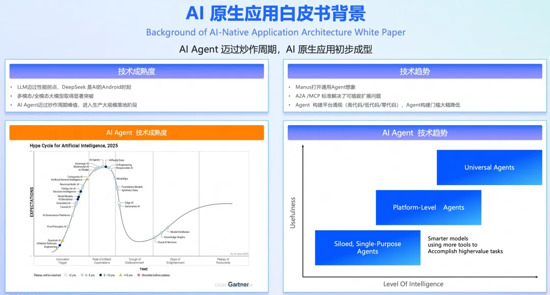 从技术成熟度看,目前 AI Agent 迈过炒作周期峰值,进入大规模探索落地阶段。