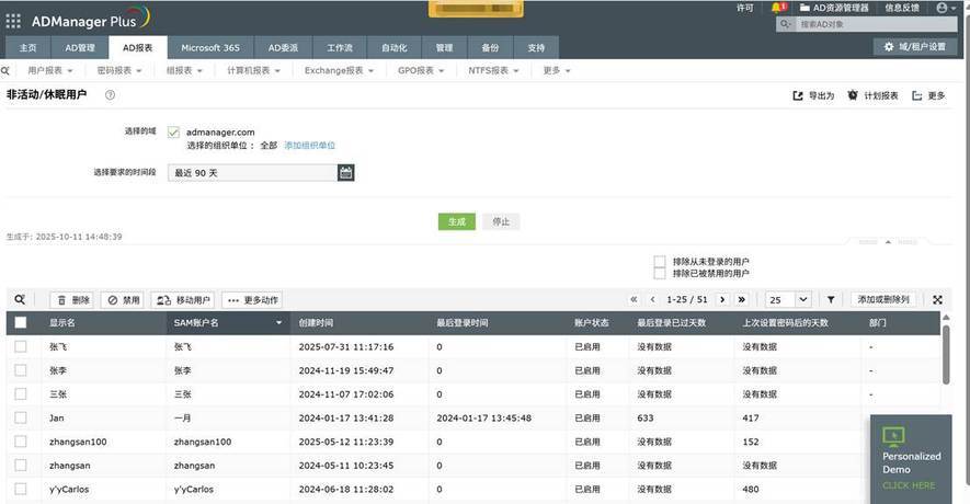 预置“30/60/90 天未登录”“密码大于 180 天未改”“邮箱从未启用”等 20+维度,点一下刷新,2 分钟出结果,比 PowerShell 快 30 倍。