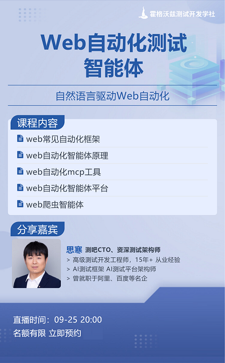 本次 Web 自动化测试智能体课程将带您探索如何利用自然语言驱动 Web 自动化测试,显著提升测试效率与智能化水平。