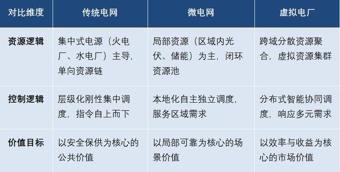 要真正理解虚拟电厂的价值,不妨将它与传统电网、微电网放在一起对比,三者的差异集中体现在“资源逻辑”“控制逻辑”和“价值目标”上: