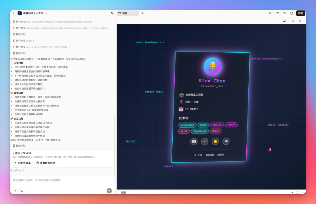 对话生成极客风格的个人主页应用,并可一键分享或者部署。