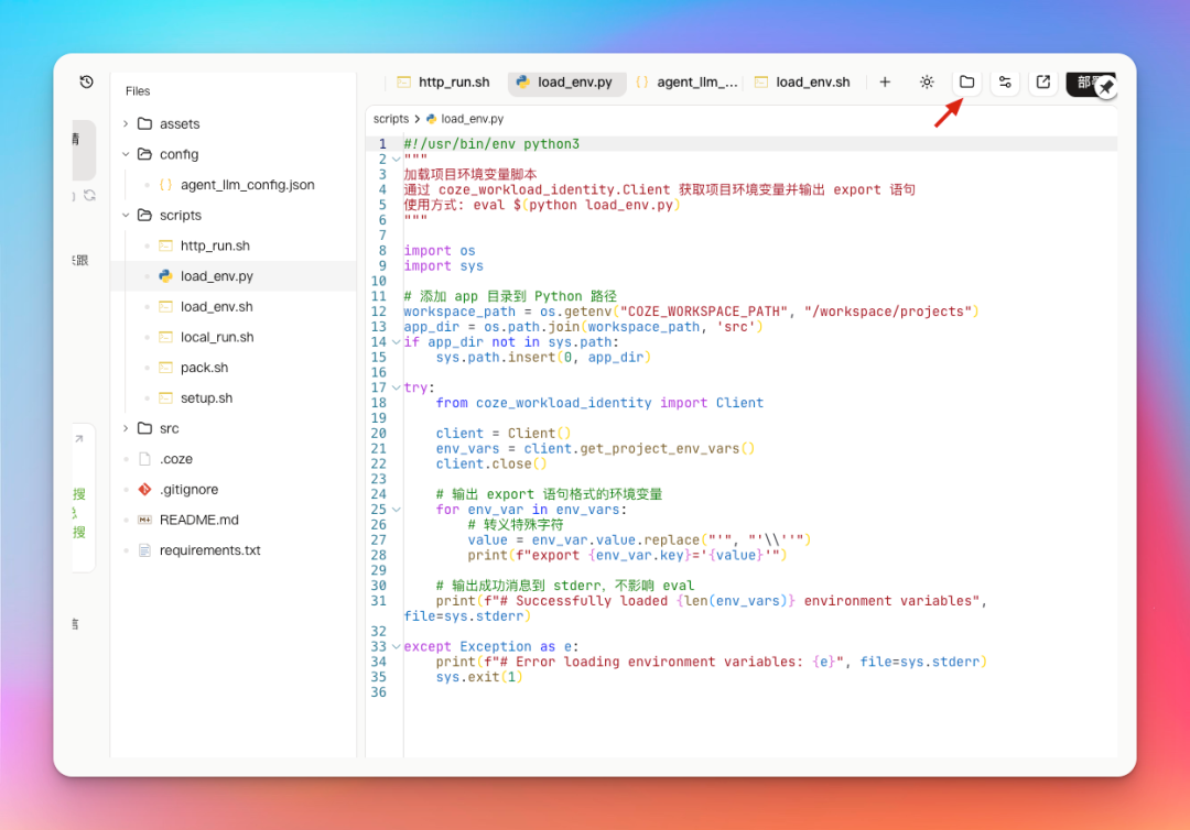 可以直接切换选择不同模型来匹配 agent 节点,在右上角可以切换文件目录,查看 agent 的代码: