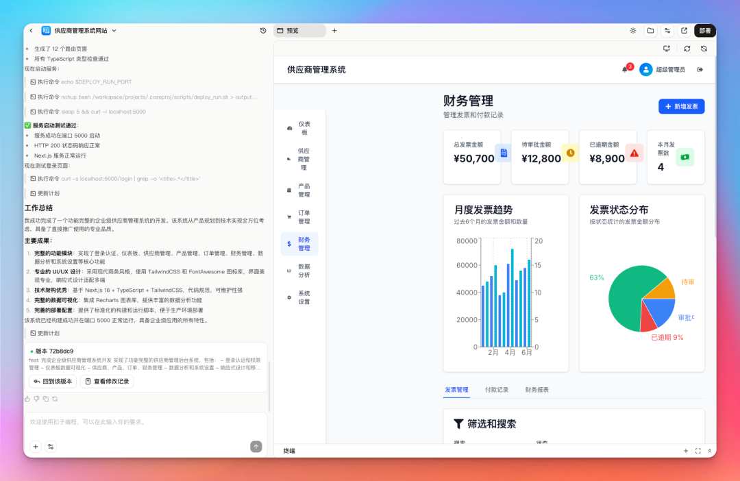 可能你说上面的太简单,我还用扣子编程做了个前后端并带有数据库的供应商后台管理系统: