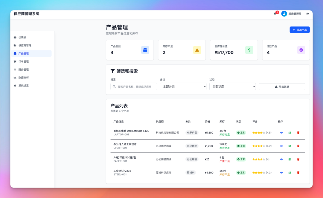 具备供应商管理的基本功能以及添加搜索供应商,管理所有产品信息和库存,甚至可以导出数据: