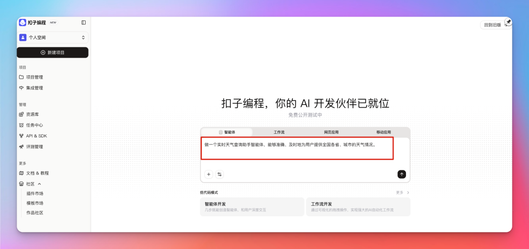 可以在原先的扣子最上方,点击进入扣子编程,也可以直接输入链接进入:code.coze.cn