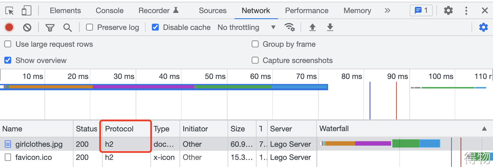与 TLS1.3 协议友商调研方法类似,通过 Chrome 浏览器加载友商的图片,在 DevTools 窗口的 Network 面板可以看到使用的是 h2 协议。