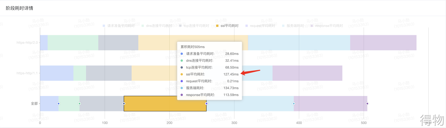 从图中可以看到,SSL 阶段平均耗时 127ms+,占累积耗时 25%以上。SSL 阶段耗时对整体耗时影响较大,因此考虑对 SSL 阶段性能优化。