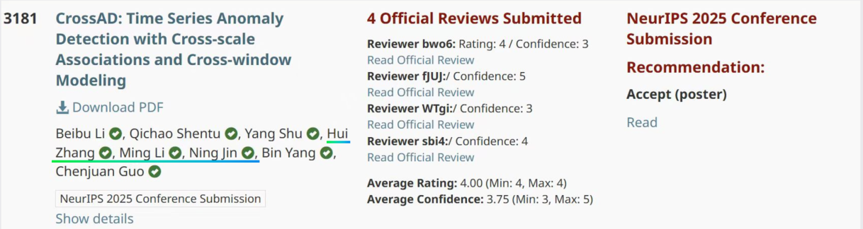 KaiwuDB 与华东师范大学数据科学与工程学院决策智能团队合作论文 CrossAD: Time Series Anomaly Detection with Cross-scale Associations and Cross-window Modeling(《CrossAD:具有跨尺度关联和跨窗口建模的时间序列异常检测》),被全球人工智能与机器学习领域的顶尖学术会议 NeurIPS 2025(Conference on Neural Information Processing Systems)录用。研究中提出的 CrossAD 时序异常检测框架,突破性地引入了跨尺度关联重建与跨窗口全局上下文建模方法,能够在复杂场景下显著提升检测性能。浪潮 KaiwuDB 董事长、浪潮数据库总经理张晖,副总经理李明,KaiwuDB 首席解决方案专家金宁为共同作者。