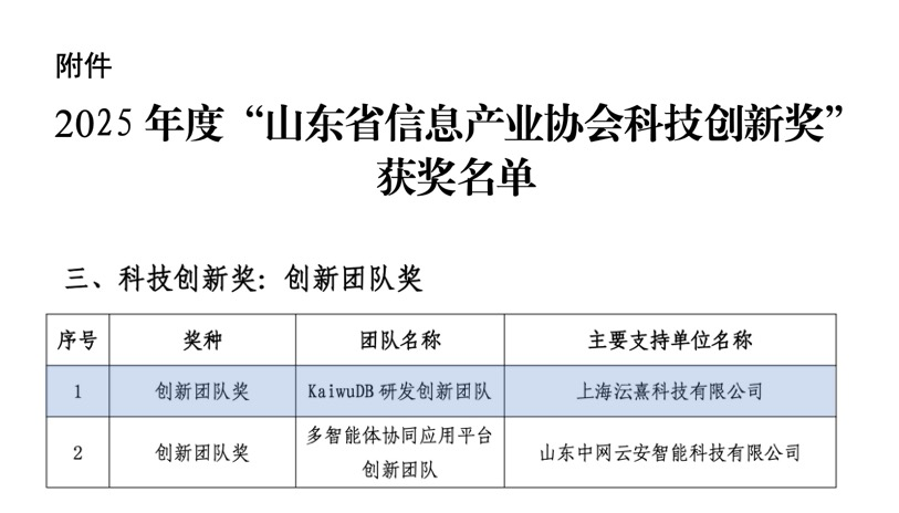 9 月 1 日,2025 年度“山东省信息产业协会科技创新奖”获奖名单正式公布,KaiwuDB 研发团队凭借在信息技术领域的突出表现,荣获“创新团队奖”。