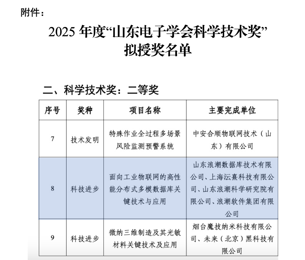 9 月 1 日,2025 年度“山东电子学会科学技术奖”公布,由 KaiwuDB、浪潮科学院与浪潮软件集团联合申报的“面向工业物联网的高性能分布式多模数据库关键技术与应用”项目,荣获科技进步二等奖。