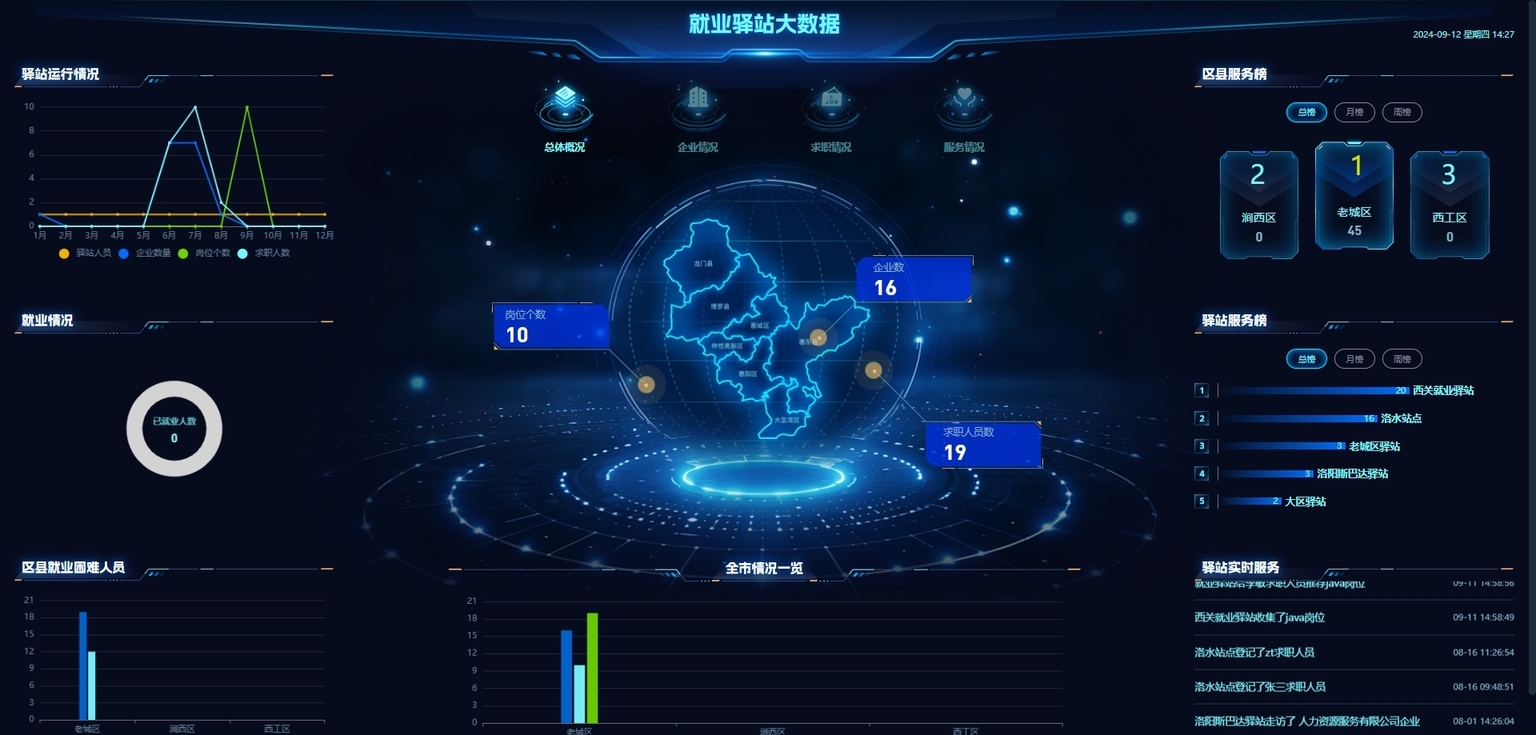 企业情况:展示企业总体情况(如企业数量、行业分布、招聘需求等),辅助企业相关就业服务决策。