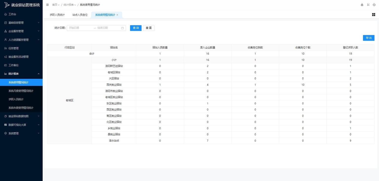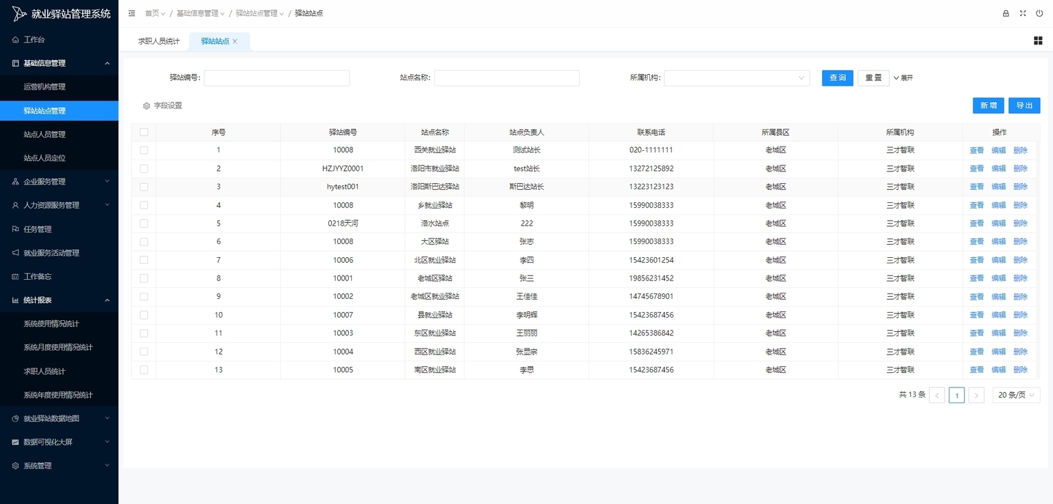驿站站点管理:管理驿站或服务站点信息,包含站点创建、编辑、删除与查询,明确就业服务站点分布与信息。