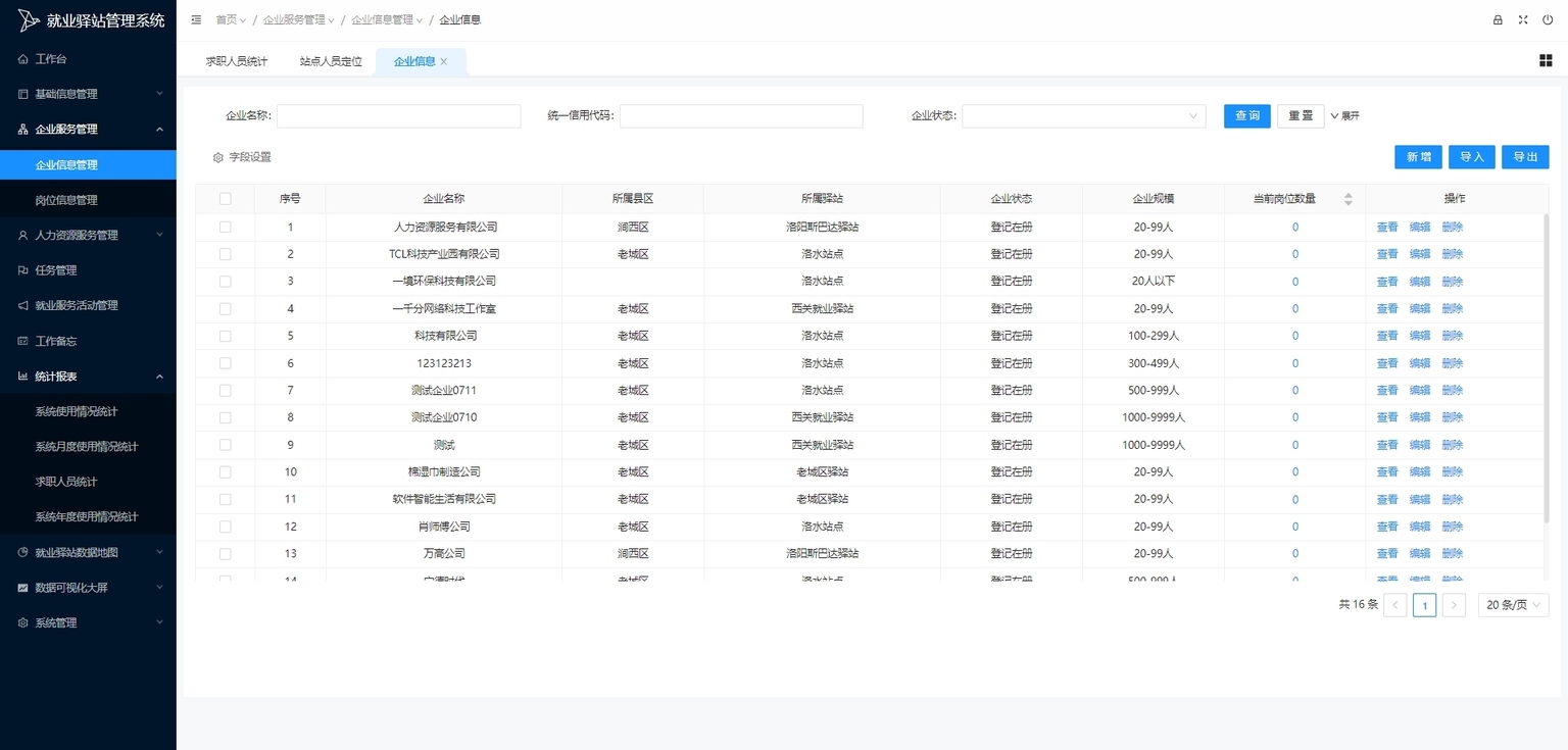 企业信息收集:收集并管理企业详细信息(如企业规模、行业类别等),为求职人员提供更精准就业服务,优化企业信息库。