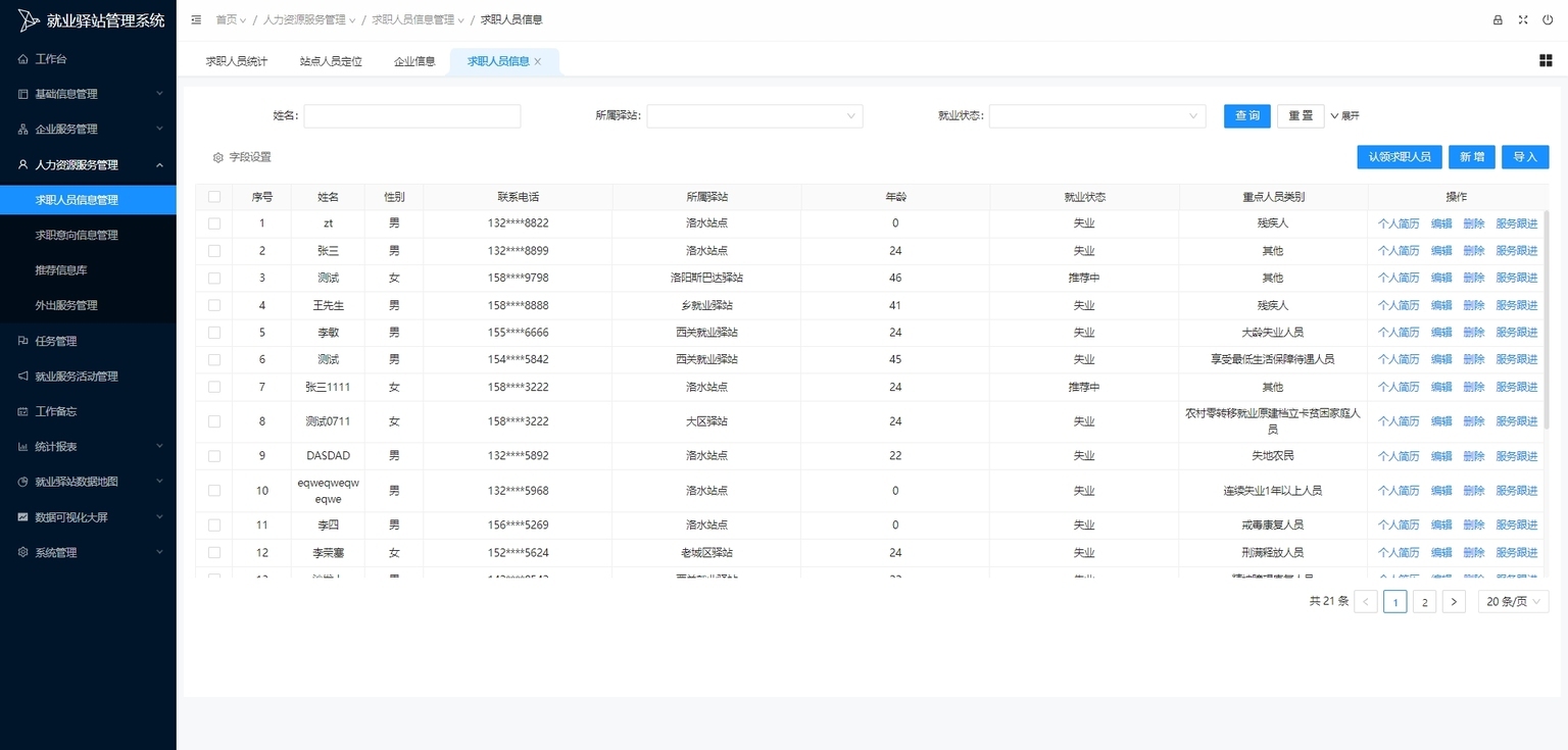 求职人员信息管理:管理求职人员个人信息(如简历、求职意向、联系方式等),全面掌握求职人员基本情况。