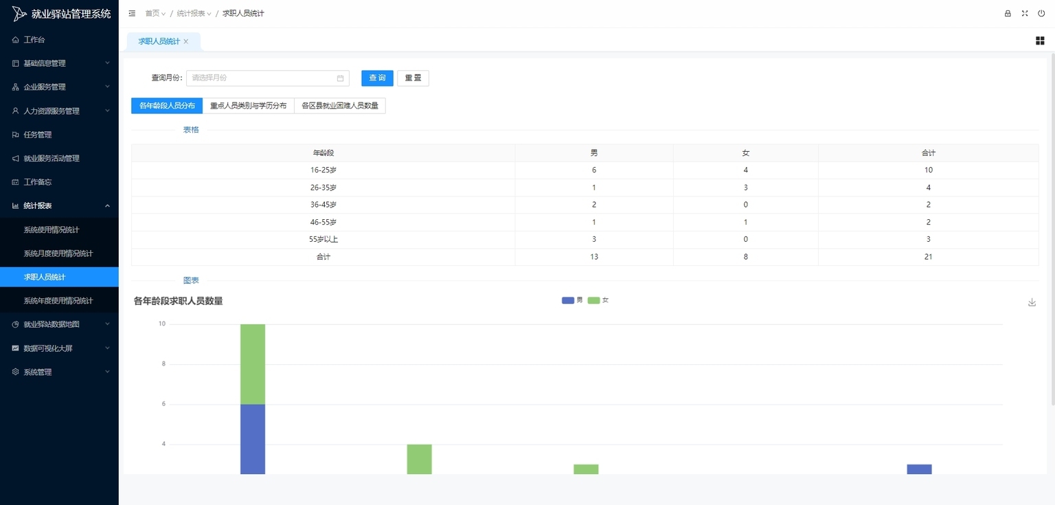 求职人员统计:统计并管理求职人员数据(如求职人数、活跃度、求职成功率等信息),助力求职人员群体分析与服务优化。