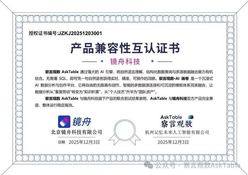 镜舟科技与察言观数(AskTable)完成产品兼容互认,携手开启智能数据分析新篇章
