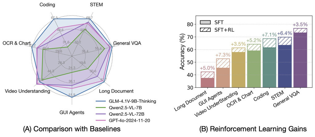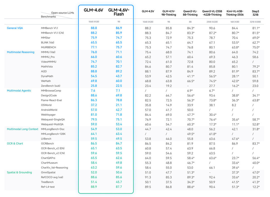 模型规模与效率: 拥有 106B 参数的基础版(可能采用 MoE 架构以优化效率),以及 9B 参数的 Flash 版本,在同等参数规模下达到领先的视觉理解性能,并实现成本优化。