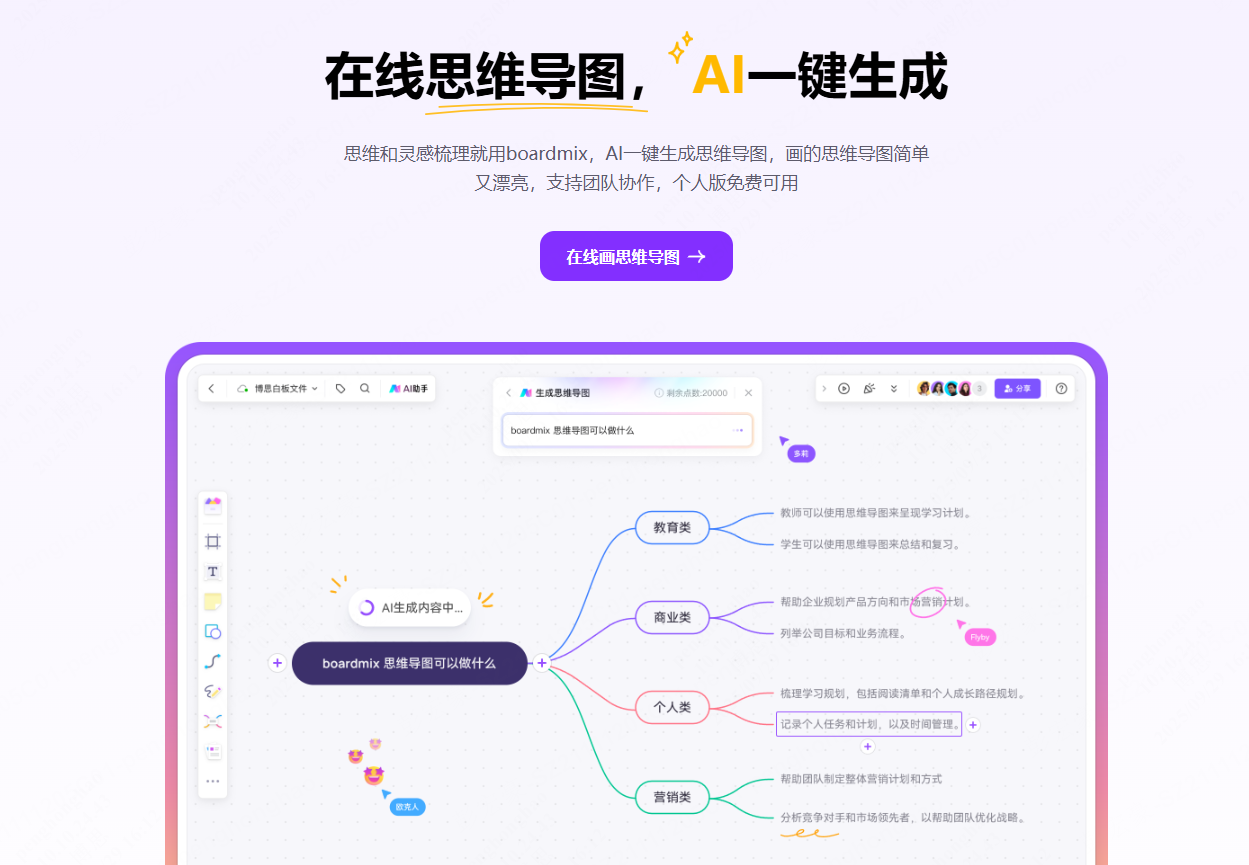 boardmix 特别适合需要频繁协作的团队使用。无论是产品经理梳理需求,设计师进行创意发散,还是教师制作课程大纲,boardmix 都能提供流畅的使用体验,基于思维导图轻松完成内容可视化呈现。