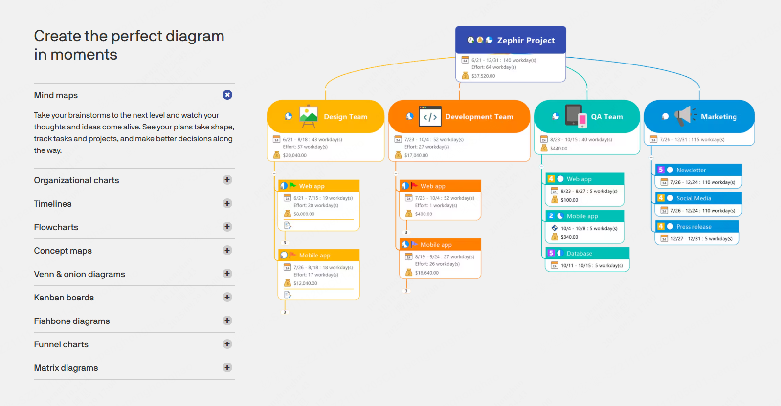 MindManager 提供了最全面的导图类型支持。除了基础的思维导图,还能创建鱼骨图、时间线、概念图、矩阵图等多种专业图表。每种图表都有精心设计的样式和布局选项。MindManager 的数据处理能力非常强大,可以导入 Excel 表格,从数据库读取信息,与 Project 进行项目管理集成。你可以给节点添加文件附件、网页链接、公式计算等丰富信息。