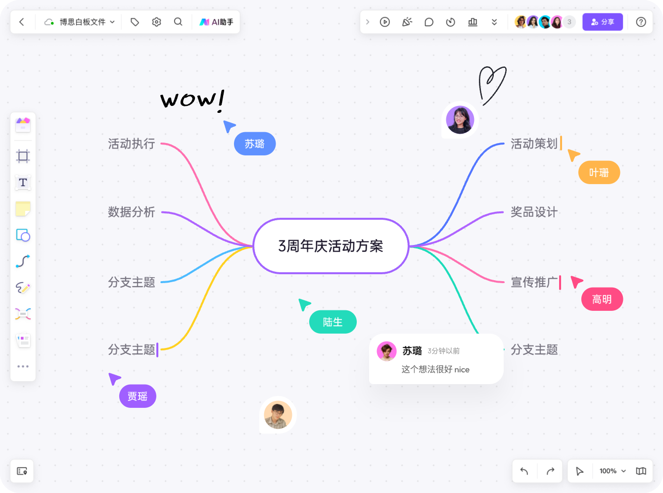 在线协作需求是首要考虑因素。如果你经常需要和团队成员一起工作,实时协作功能必不可少。boardmix、Miro、MindMeister 这类工具支持多人同时编辑,每个人的操作都能即时同步。评论、讨论、任务分配等功能让团队沟通变得顺畅。相反,如果你主要是个人使用,MindNode、Effie 这类专注个人效率的工具可能更合适。