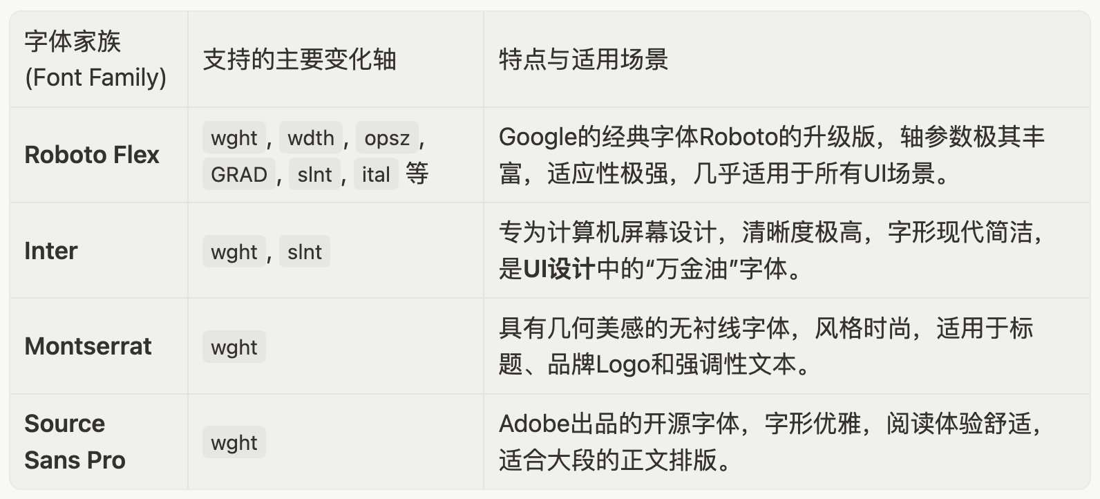 在 Google Fonts 等平台上,你可以找到大量优秀的开源可变字体。它们通常拥有完善的“变化轴”,能够满足多样化的设计需求。