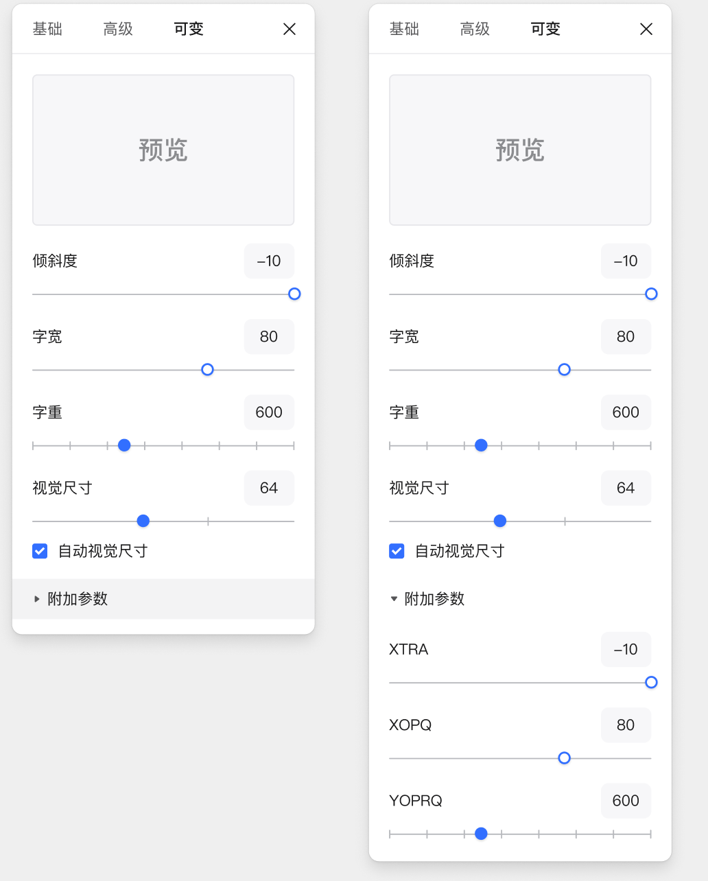 进入可变轴设置面板后,你将看到一系列对应不同“变化轴”的滑块和输入框。例如,“字重 (wght)”滑块可以让你在 100 到 900 之间自由拖动,实时预览文字从纤细到粗壮的无缝变化;“倾斜 (slnt)”滑块则能精确控制文字的倾斜角度。你可以通过拖动滑块进行感性的、即时的视觉调整,也可以在输入框中填入精确的数值,以满足严格的品牌规范。每一次调整,画布上的文本都会即时响应,方便实时预览字体效果。