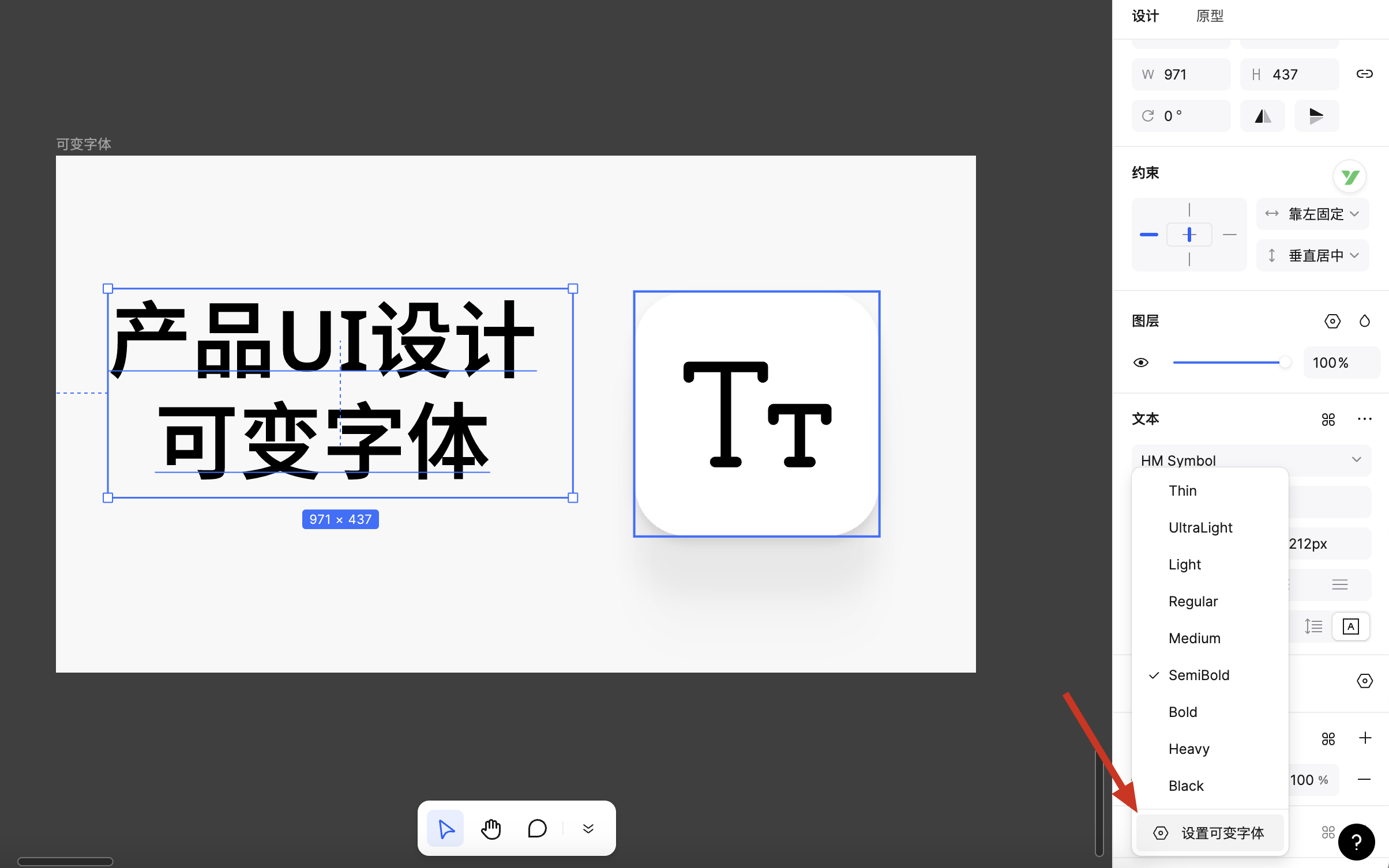应用了可变字体后,Pixso 为你提供了两种方式来打开可变字体的字重设置面板。