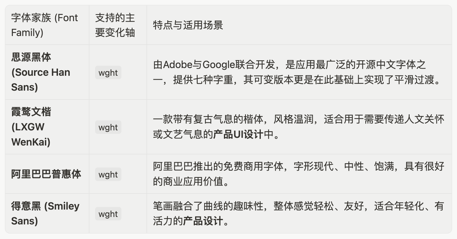 中文因为字符集庞大,制作可变字体的技术难度和成本更高,但依然涌现出了一些优秀的免费开源字体,极大地推动了中文产品设计的进步。