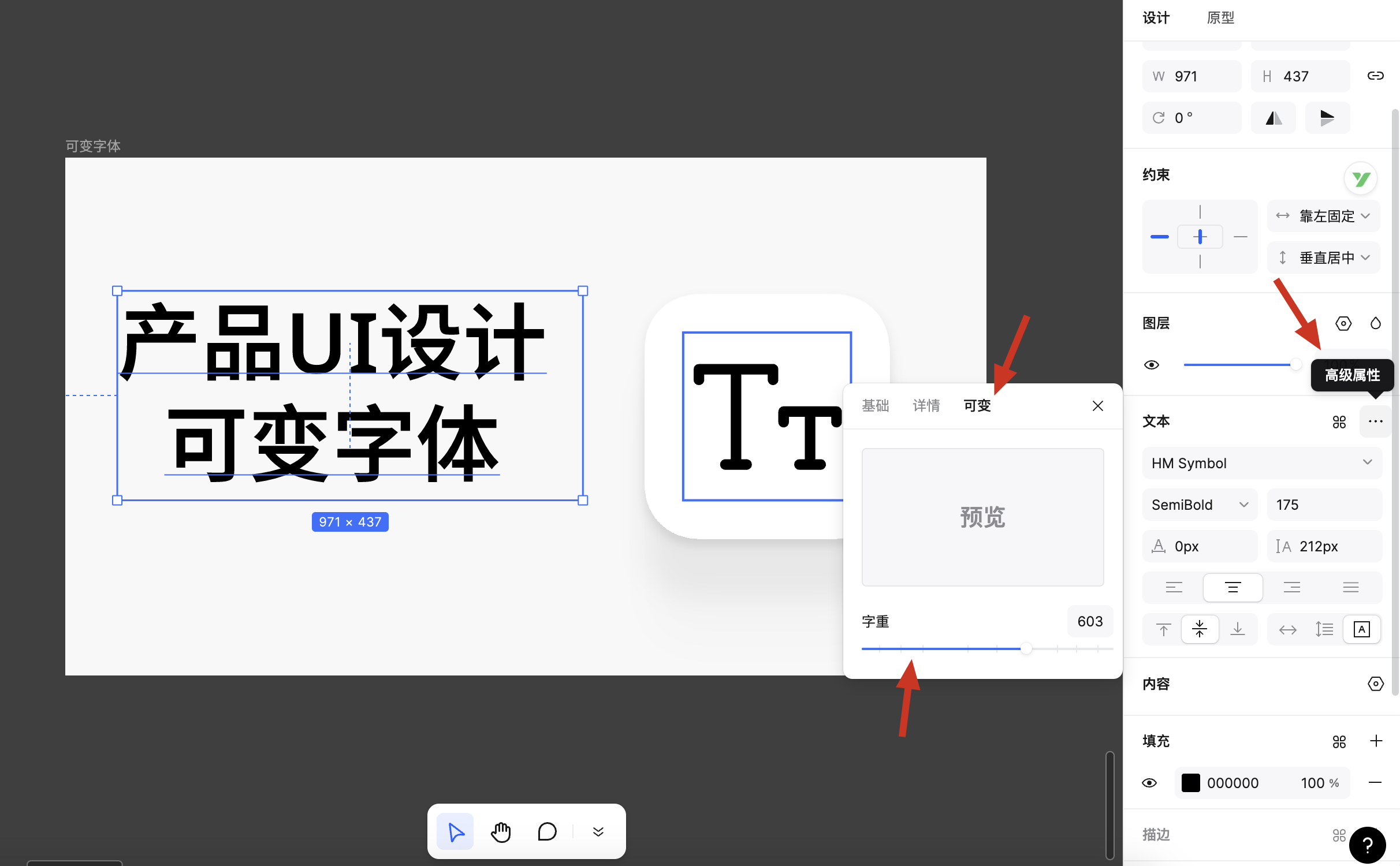 在 Pixso 的画布上,当你选中一个文本图层后,可以在右侧的设计面板中找到“文本”属性区域。点击字体名称的下拉菜单,Pixso 会展示出所有可用的字体。你也可以直接在 Pixso 内置的字体库中筛选,或者使用你通过“团队字体库”上传的自有可变字体。选择一款心仪的可变字体,例如系统内置的“HM Symbol”字体,将其应用到你的文本上。