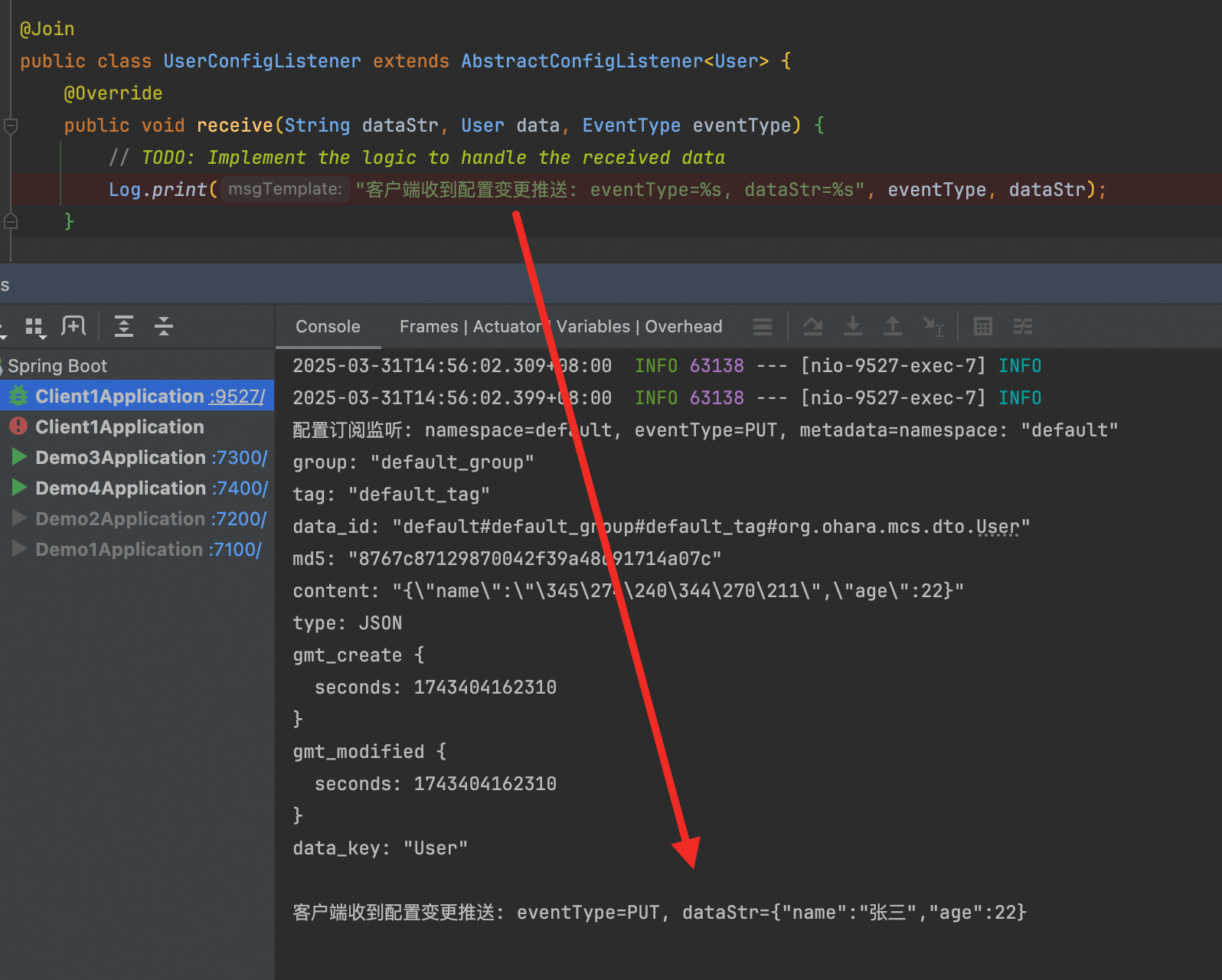 @Join // ohara-mcs SPI扩展机制注解,用于识别客户端用户自定义的监听器 public class UserConfigListener extends AbstractConfigListener<User> { @Override public void receive(String dataStr, User data, EventType eventType) { // TODO: Implement the logic to handle the received data Log.print("客户端收到配置变更推送: eventType=%s, dataStr=%s", eventType, dataStr); }}