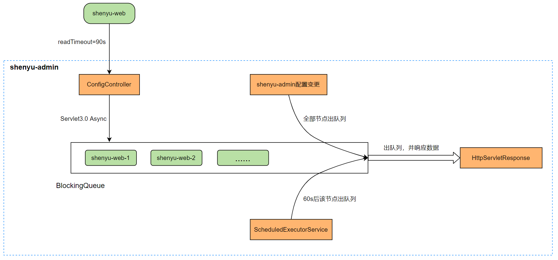 举个🌰,假设我们的 admin 节点有 20 台容器实例,那么就需要每个 Shenyu 网关内核阻塞 20 个线程向 admin 发起轮询,另外网关本身也会有一些定时任务线程和守护线程的占用(例如 Shenyu 的 Plugin 定时加载机制)。这样会导致本该尽量分配给处理用户请求的线程资源浪费在系统内部处理上。