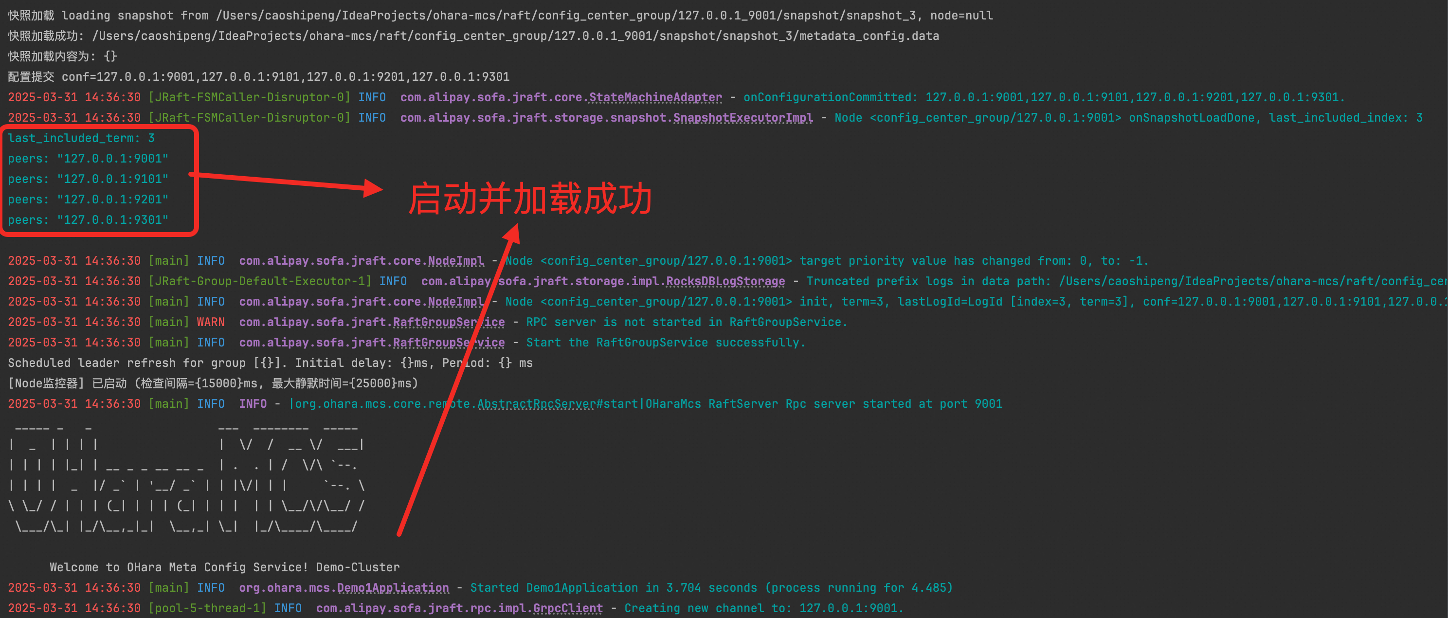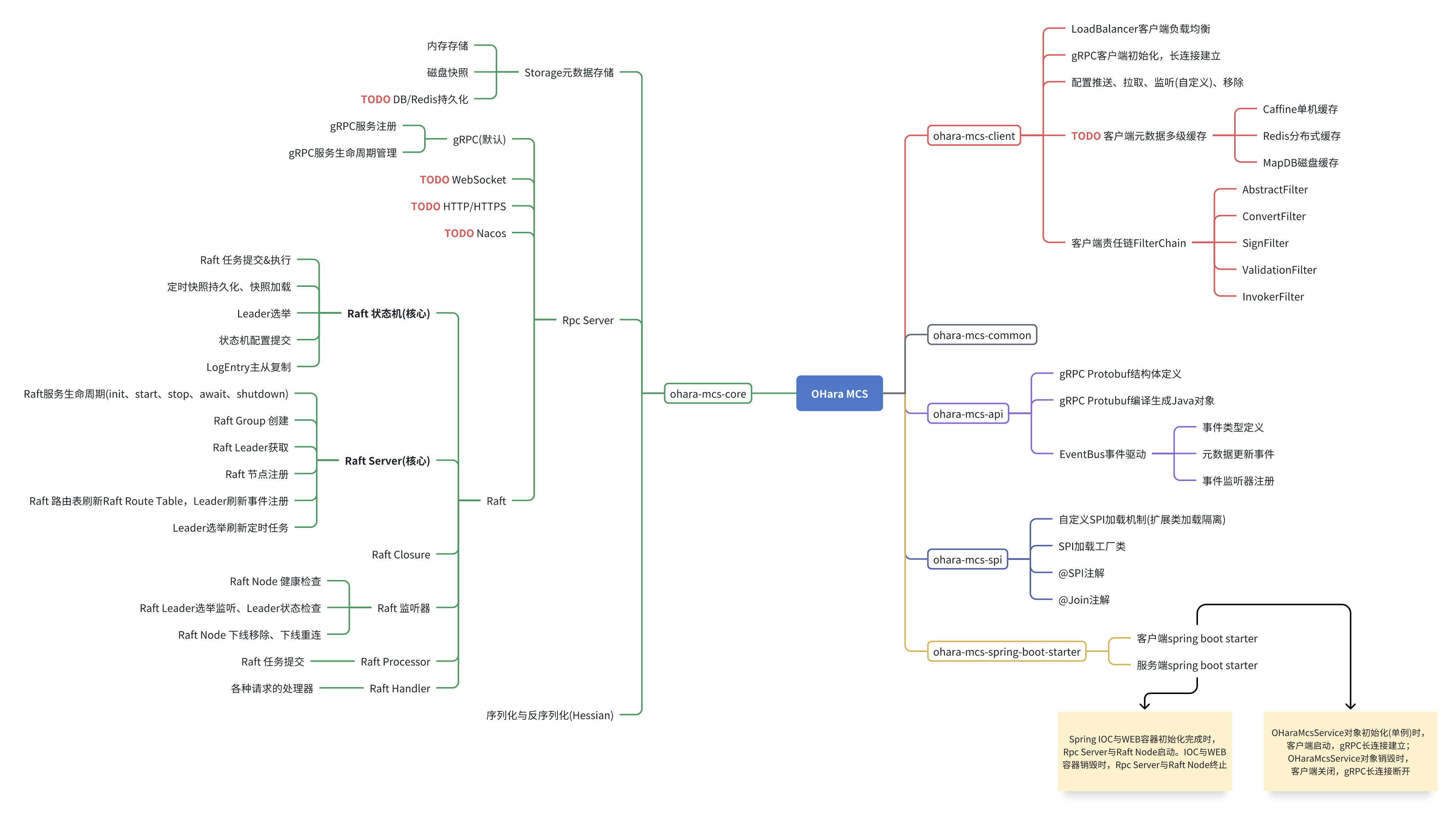 ohara-mcs # OHara MCS(Metadata Config Service) ├── logs # 日志输出 ├── ohara-mcs-api # API定义、gRPC结构体定义、Protobuf编译时生成gRPC类对象 ├── ohara-mcs-client # 客户端SDK ├── ohara-mcs-common # 通用组件、工具类 ├── ohara-mcs-core # gRPC服务、Raft服务核心模块 ├── ohara-mcs-demo │ ├── ohara-mcc-demo-cluster1 # 模拟服务端集群 -> 元数据(监听、推送)、集群Leader选举、服务注册、服务发现... │ └── ohara-mcc-demo-cluster2│ └── ...│ └── ohara-mcs-demo-client1 # 模拟客户端集群 -> 配置监听、推送、读取...│ └── ohara-mcs-demo-client2│ └── ...├── ohara-mcs-spi # 自定义SPI扩展机制 ├── ohara-mcs-spring-boot-starter │ ├── ohara-mcs-client-spring-boot-starter # 客户端 -> spring-boot-stater│ └── ohara-mcs-server-spring-boot-starter # 服务端 -> spring-boot-stater└── raft # Raft协议核心日志存放文件夹 ├── config_center_group # 配置中心Raft分组(eg: 服务配置分组、服务实例分组) └── ip_port # 通过IP+端口区分集群实例 └── logs # Raft日志(LogEntry),用于集群Leader选举、动作复制 └── meta # Raft过程元数据存储 └── snapshot # Raft快照文件,用于断电恢复、启动时配置加载、定期快照备份